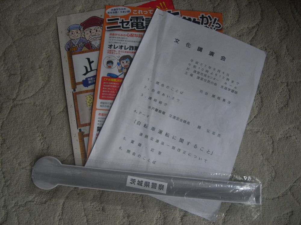 今日は地元の渡里住民の会主催の文化講演会「自転車運転に関すること」が開催されるので、9時40分に家を出て渡里市民センターへと向かいました。受付で「ニセ電話詐欺」などのイラスト入りパンフレットと、腕などに巻き付けて使用する反射板を受け取り席に着きました。講師として水戸署より交通安全課長さんが招かれて、定刻の10時に講演会が開始し、6月1日からの道路交通法の一部改正に関したスライドやビデオを交えたお話を聞きました。知っていそうで知らないことや、事故の賠償責任に関することなども知ることが出来、複雑多様化している現実に対応できるよう、一人一人が「危険」を意識することが重要な時代となっているようです。定刻の11時30分に講演会が終了し解散となりました。