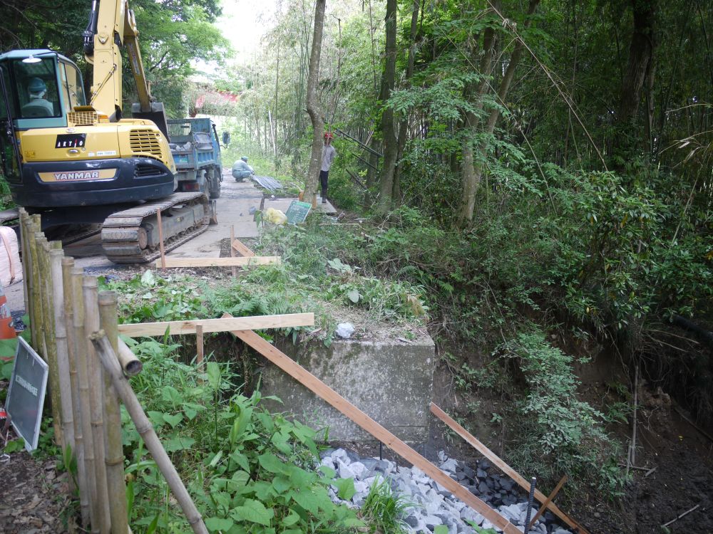 「渡里湧水群を活かす会」の平日活動日初日の今日は15名の参加により、これまでの竹を切り倒すことに専念してきたことによる作業から、どのように処理するかの検討を迫られる段階へと変わってきました。方法はいくつかの案が検討中なのですが、決定されるまでの間にも作業を進めようということで、枯れた竹を中心に150センチに切りそろえたものを引き取ってもらう方法をスタートさせました。この方法はストックさせたものを確実に引き取ってもらえることになっていることから、自前での処理方法がどのようなものに決定しても併用できることから本日よりの開始となりました。現在一帯では複数の復旧工事が水戸市により進められており、送水管の補強が終了しましたが、危険箇所の埋め立て補強工事が開始されていますし、他にも一昨年の台風によるがけ崩れ箇所など3箇所に工事が入っています。